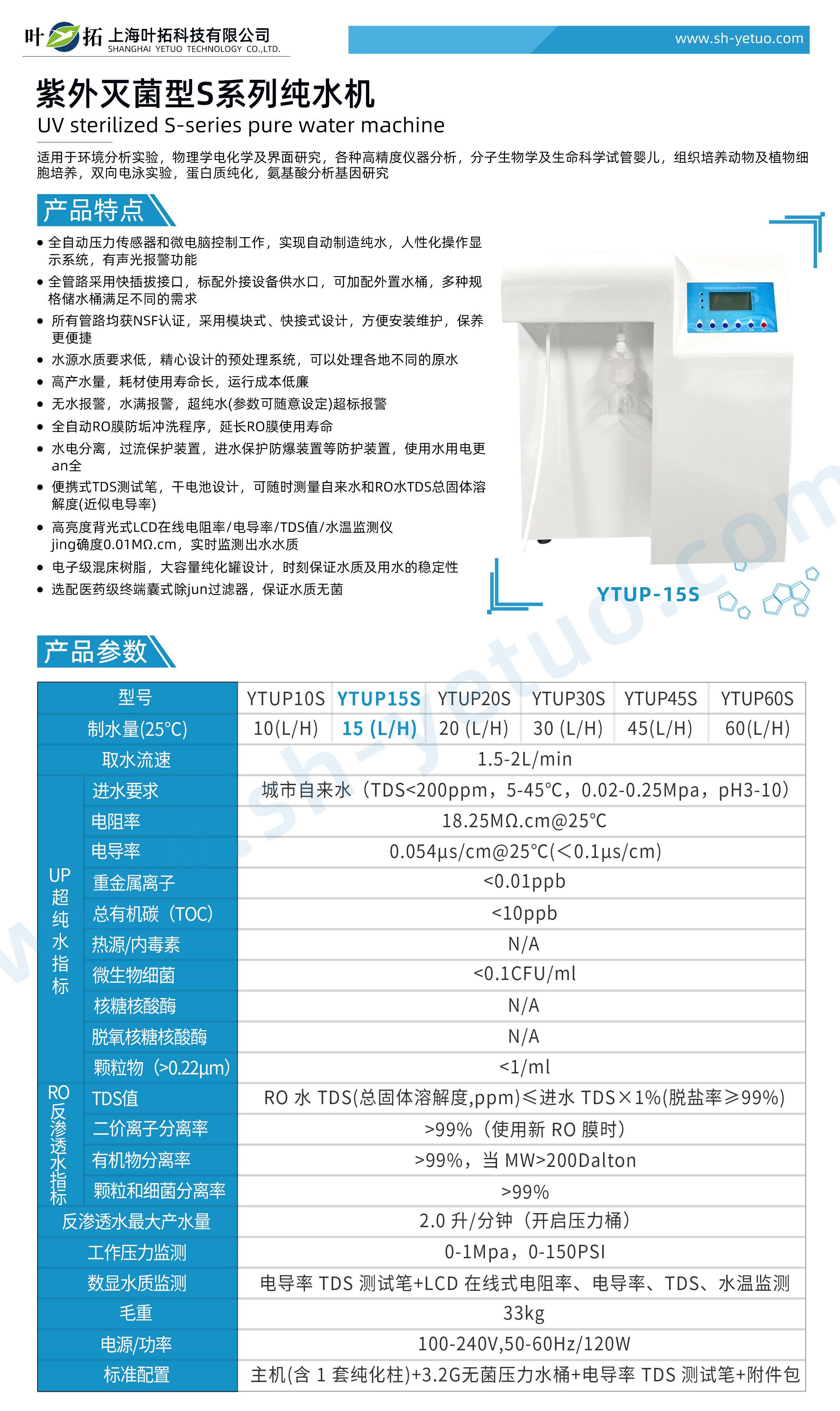 葉拓 YTUP15S 標(biāo)準(zhǔn)型超純水機(jī)詳細(xì)參數(shù)